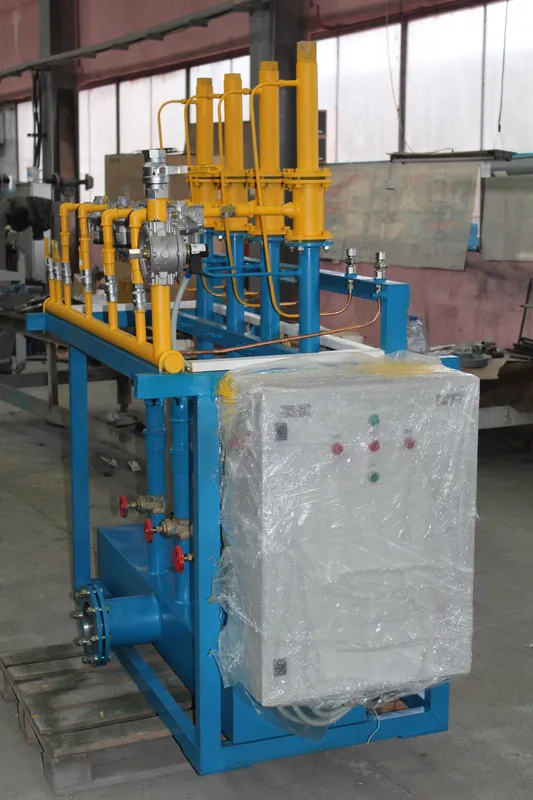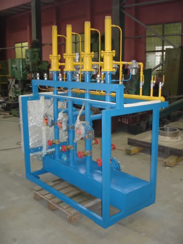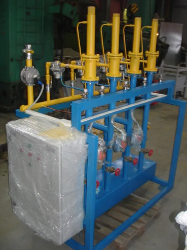 Установка представляет собой моноблок, включающий в себя трубопроводы с установленным на них запорной и регулирующей аппаратурой для подачи газа и воздуха, для последующей подачи газовой смеси к коллекторам газовых горелок выработочного канала или каналов питателей.